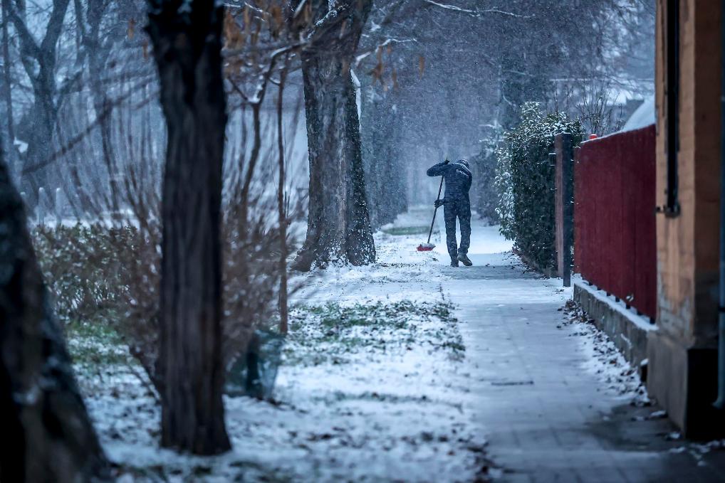 1月5日,在匈牙利布達佩斯,當?shù)鼐用裨诖驋呗访娣e雪。新華社發(fā)(鮑洛格·達維德 攝)