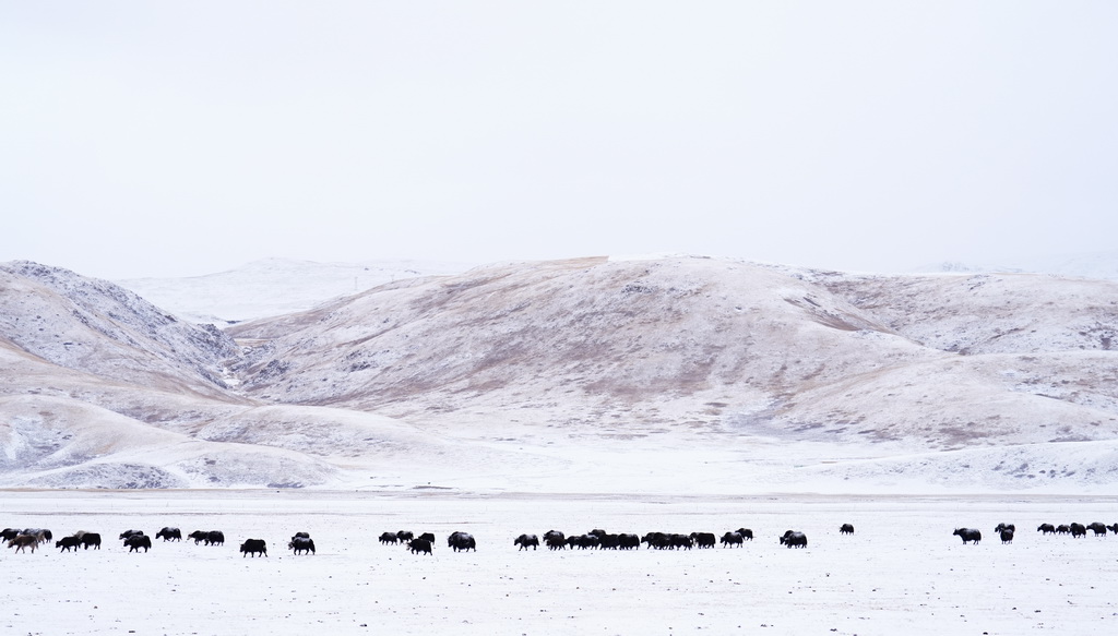 1月29日,一群牦牛在青海省玉樹藏族自治州雜多縣境內(nèi)的草原上覓食。