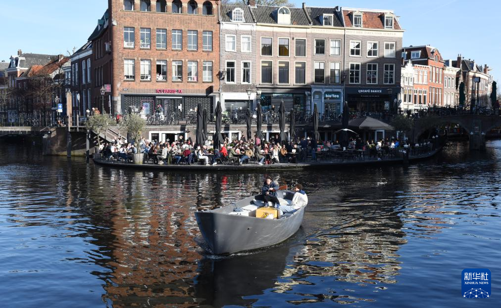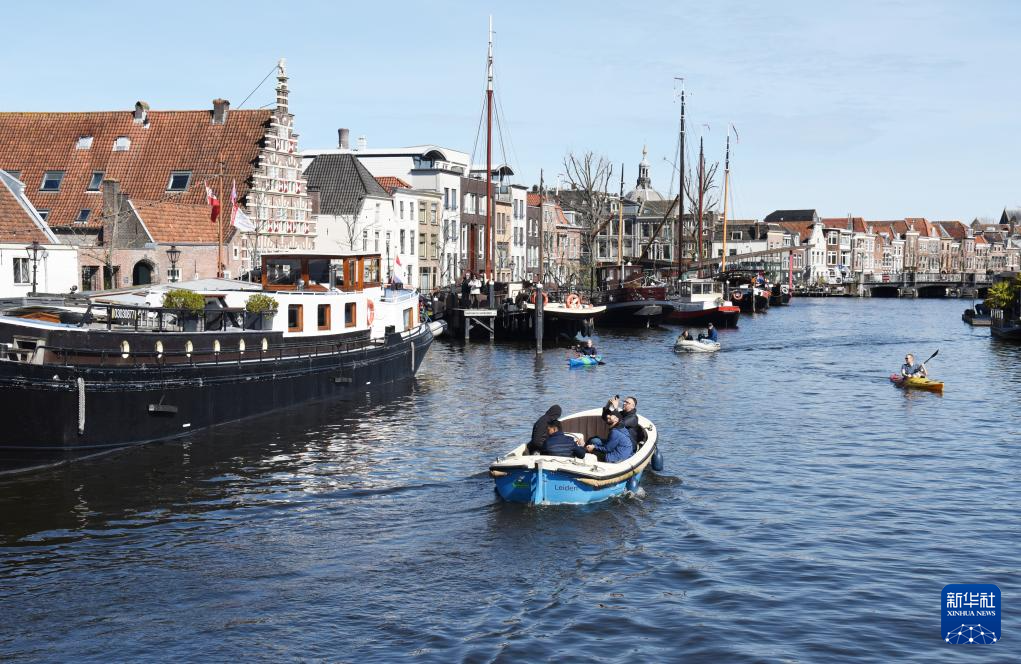 4月6日,在荷蘭萊頓,人們乘船欣賞城市風(fēng)景。