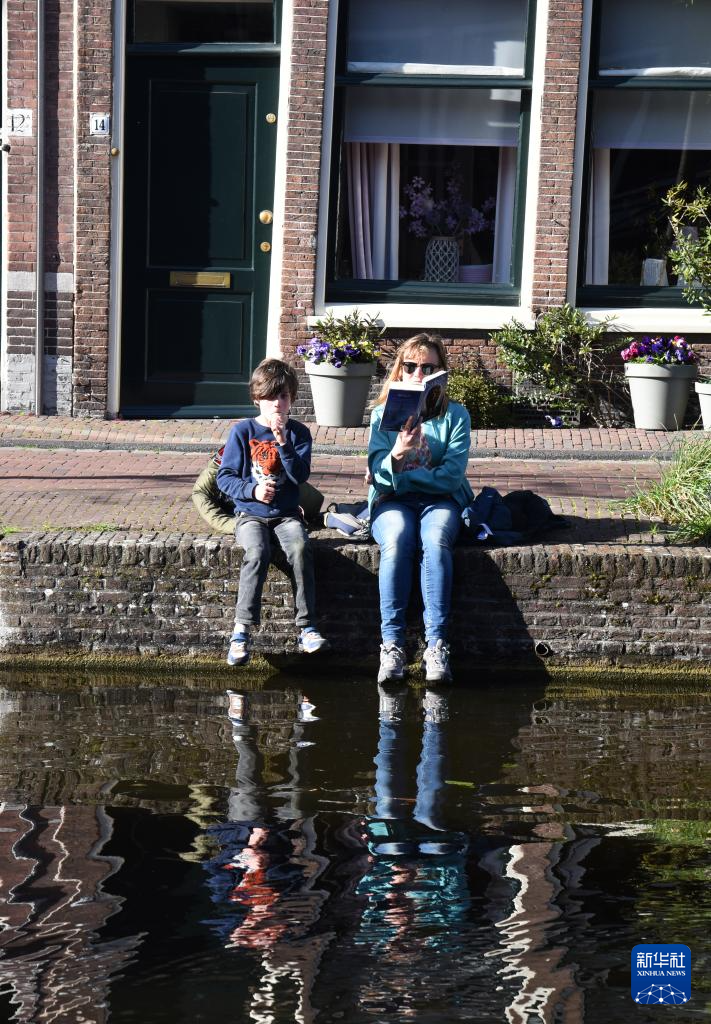 4月6日,在荷蘭萊頓,人們坐在運(yùn)河邊休閑。