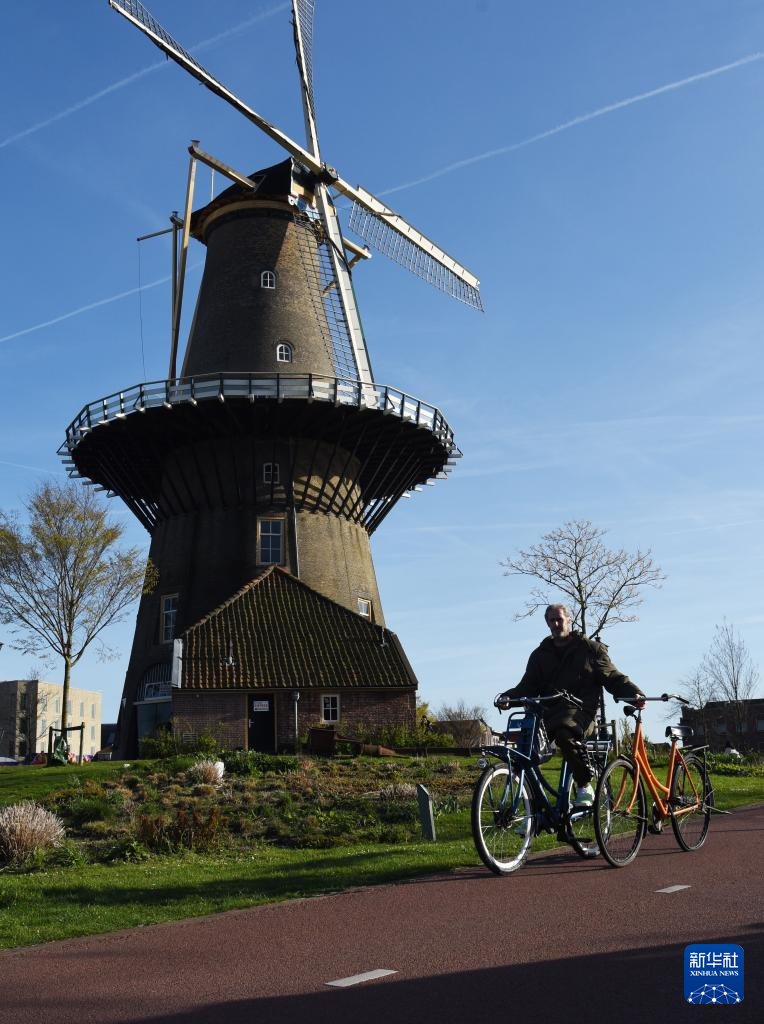 4月6日,在荷蘭萊頓,一名男子騎車從風(fēng)車旁經(jīng)過。